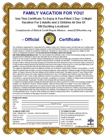 With this in mind, we've organized Family Vacation Certificates you can give to clients as an incentive. You can print these at will, giving you a constant supply of incentives/rewards. (You can even use them yourself!)